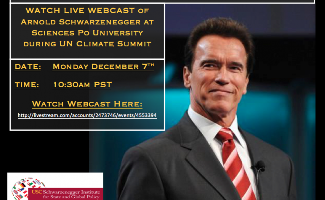 WATCH THE LIVE WEBCAST of the climate leadership discussion during COP 21 with Arnold Schwarzenegger at Sciences Po University in Paris, on December 7, 2015 at 10:30am PST (7:30pm Paris Time)!. SEE LINK BELOW! The USC Schwarzenegger Institute is partnering with Sciences Po University Paris School of International Affairs, to host a climate leadership discussion with Governor Arnold Schwarzenegger and students from Sciences Po University.