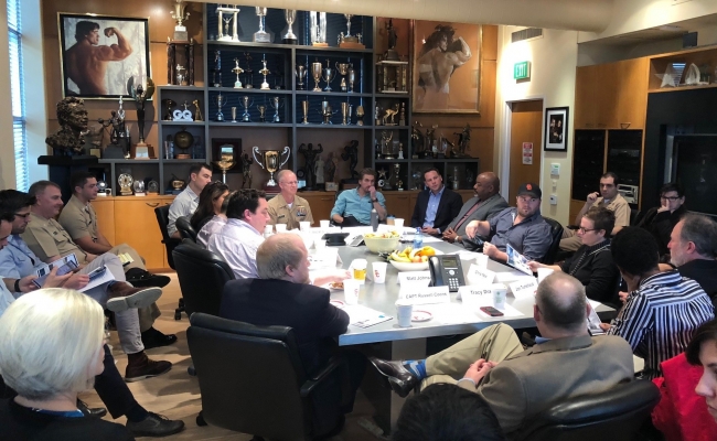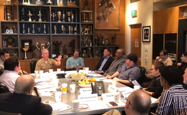 The USC Schwarzenegger Institute was proud to continue its collaboration with the armed forces by hosting a round table conversation with the new Commander of the Pacific Submarine Force, Rear Admiral Daryl Caudle. On January 19th Admiral Caudle visited Governor Schwarzenegger's production company offices for a round table conversation on the the emerging undersea technology that the United States Navy is currently utilizing and testing in the pacific theater of operations. Joining the Admiral for the conversation were senior writers, directors and producers from across the entertainment industry interested in building a deeper understanding of the the United States military's operations and personnel.