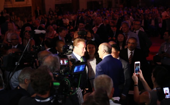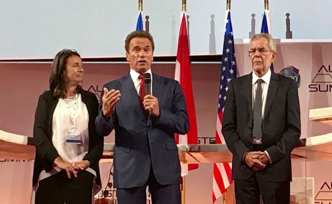 Vienna, Austria -- Less than three weeks after President Trump announced his intention to pull the United States out of the Paris Climate Agreement, Governor Schwarzenegger reminded the world that it will take more than one man to stop the global march towards a clean energy future. Arnold said "one man will not stop our progress, one man will not bring back the dirty energy of the past, one man will not defeat us. We will win, we will succeed, and we will create a future our children and grandchildren can be proud of."