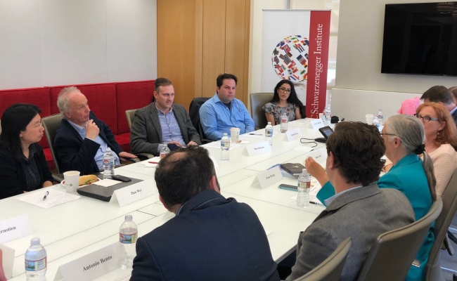 Oxford University Emeritus Professor Nick Jelley visited the Schwarzenegger Institute on April 11th to participate in a conversation on renewable energy. Professor Jelley is writing a new book for Oxford University Press entitled A Very Short Introduction to Renewable Energy and the Schwarzenegger Institute organized a round table meeting to help him with his research and introduce him to some of California’s leading academics and policy practitioners working on clean energy and carbon emissions reduction.