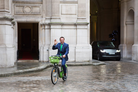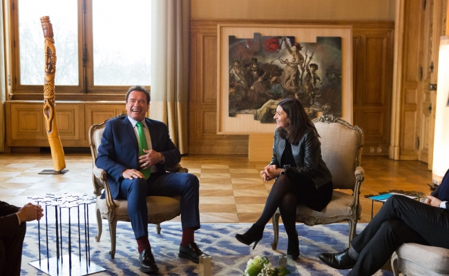 Arriving by bicycle Governor Schwarzenegger met with Paris Mayor Anne Hidalgo to discuss the continued importance of subnational action at both the state and city level.