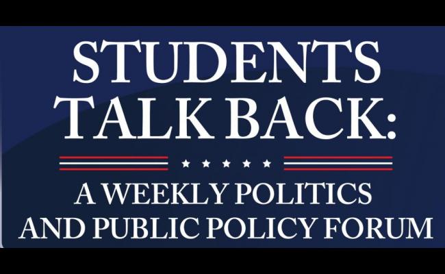 The purpose of Students Talk Back is to provide a fair and informative discussion on the most pressing public policy challenges facing local, state, and federal government. Each Students Talk Back lunch features a bi-partisan panel of students and professionals, specifically one Democratic and one Republican student paired with one Democrat and one Republican professional.