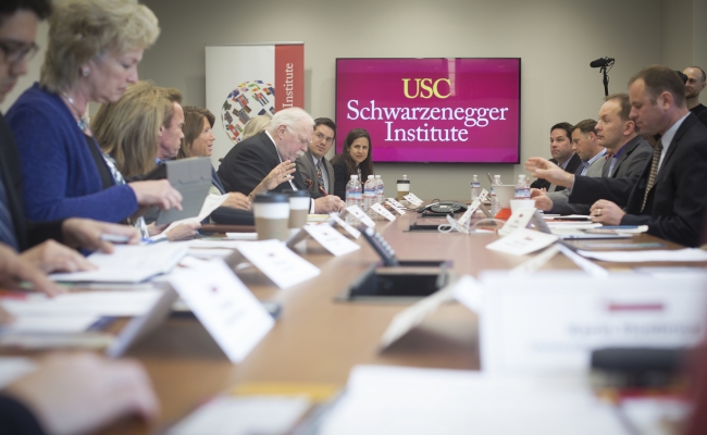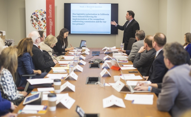 The Schwarzenegger Institute firmly believes that public policy is best formed when guided by facts and data and actively works with academics, political stakeholders and non-government organizations to find areas of mutual interest and collaboration. As part of those efforts the Institute convened a strategy meeting at the University of Southern California to discuss Grose’s research and to examine various political reform efforts currently underway in America and their potential effect on polarization in politics at the state and federal level. The meeting included Governor Arnold Schwarzenegger, leading political scientists from USC, Cal Tech, NYU, Washington University in St. Louis and Stanford as well as senior leaders from Common Cause, AARP, Open Primaries, the Bipartisan Policy Center, IndependentVoter.org and the California Chamber of Commerce.